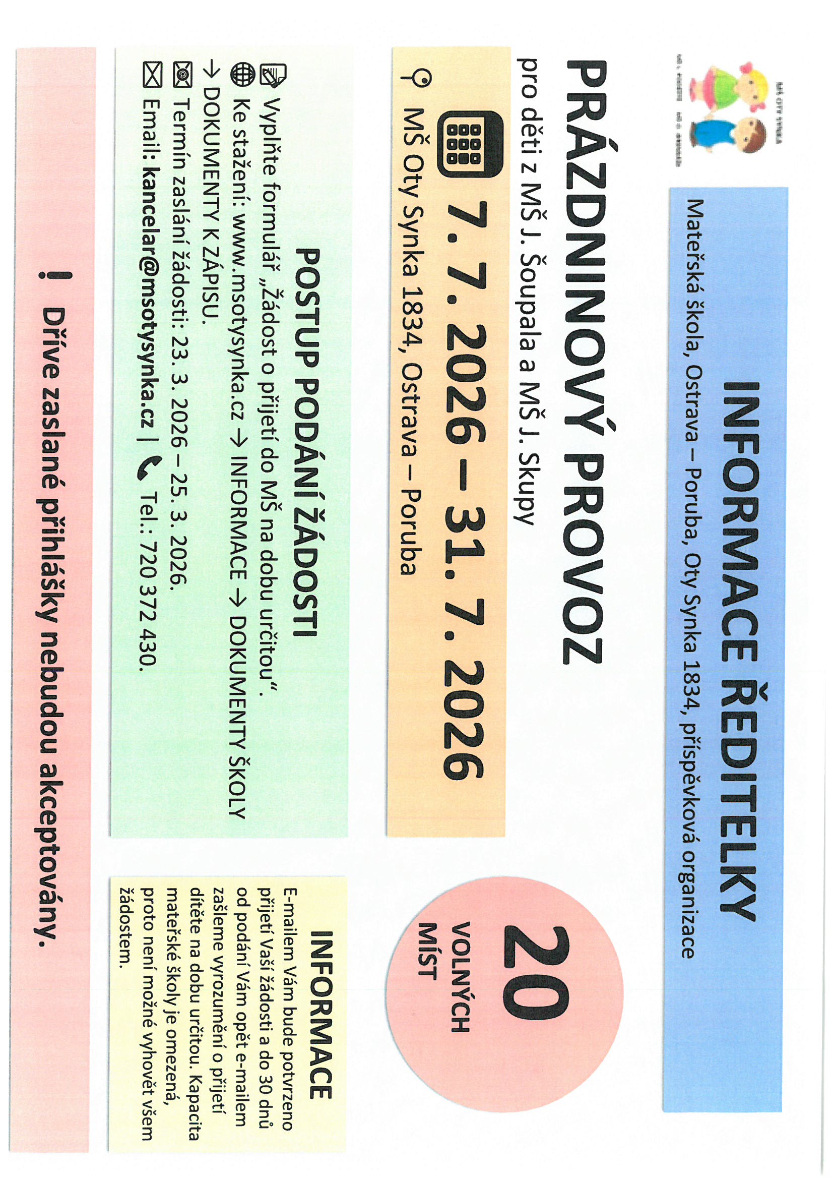 Prázdninový provoz pro MŠ O. Synka -informace ředitelky MŠ J. Šoupala